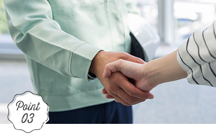 豊富な経験と実績により、どのような状況にも対応できるスキルを持ち、柔軟な対応力でお客様のニーズに合わせた最適な解決策を提供。また、高品質の施工をお約束し、お客様の満足を最優先に考えています。